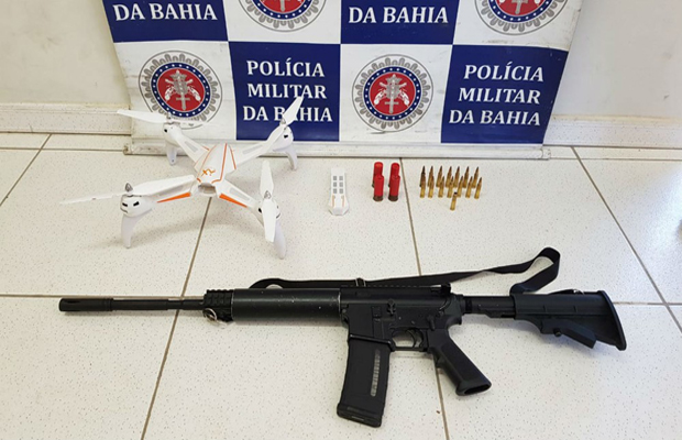 Fuzil e drone foram apreendidos com quadrilha em Porto Seguro (Foto: Divulgação/SSP-BA)