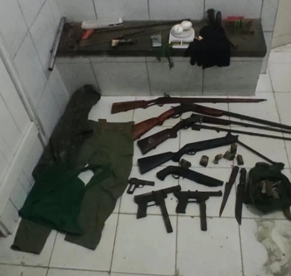 Os policias descobriram com a dupla quatro armas industriais (uma espingarda. 22; uma pistola 6.35, uma espingarda 12 e uma espingarda duplo calibre .32 e .36); quatro armas artesanais, duas armas brancas. Também foram localizadas munições de vários calibres.