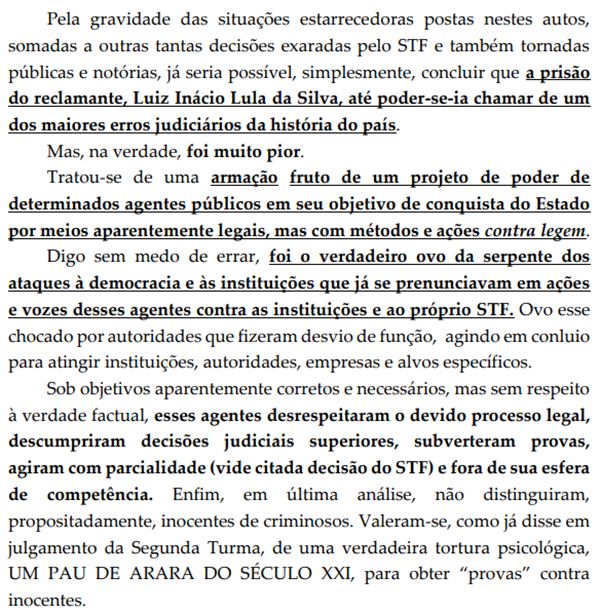Ele também afirma que a prisão de Lula foi "o verdadeiro ovo da serpente dos ataques à democracia e às instituições", chocado por autoridades que desviaram de suas funções para agir em conluio e "atingir instituições, autoridades, empresas e alvos específicos".